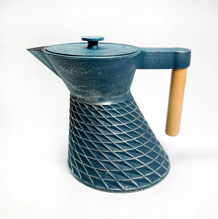 Teiera in ghisa JIDOSHA con manico in legno. Dotata di un filtro in acciaio inox ampio e fitto. Colore Petrolio e Argento