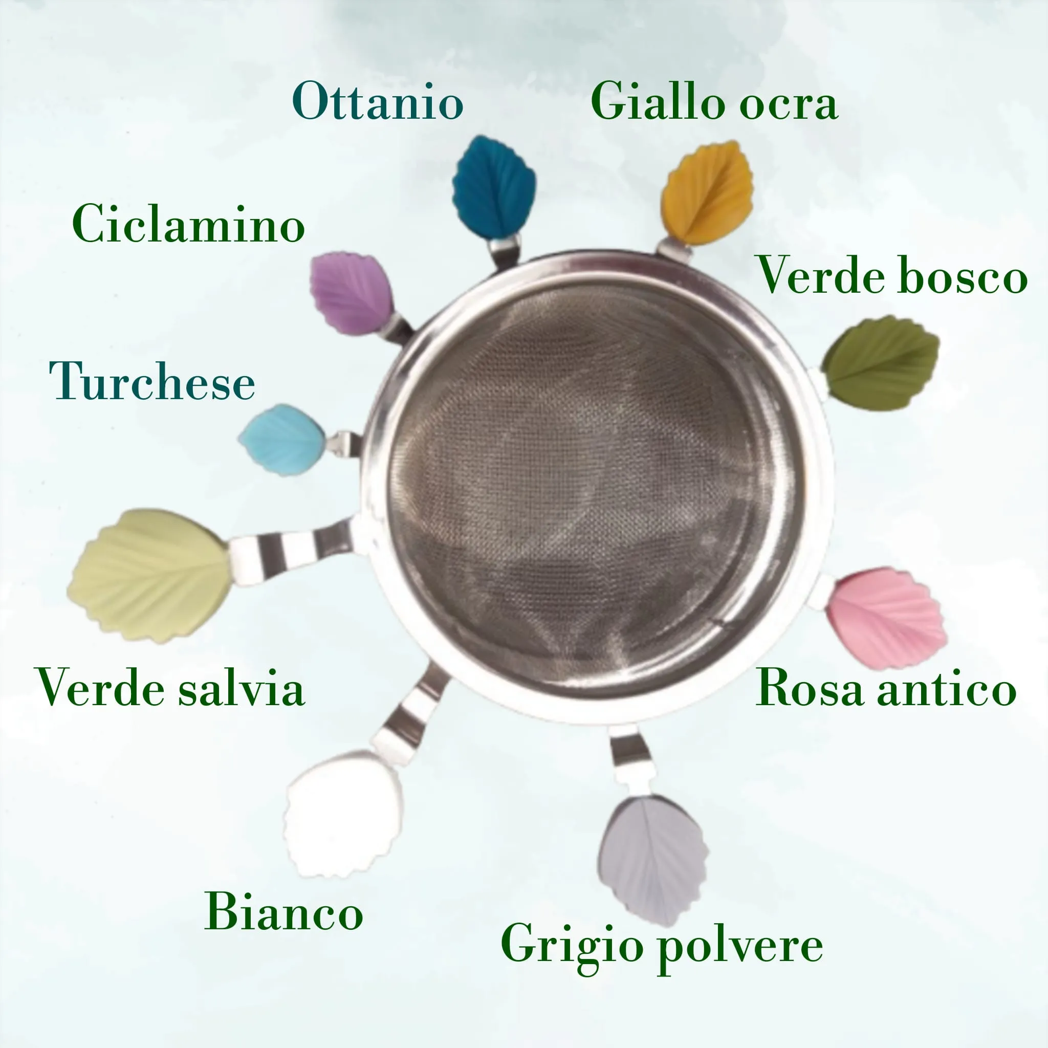 | Colore foglia | Bianco, Ciclamino, Giallo ocra, Grigio polvere, Ottanio, Rosa antico, Turchese, Verde bosco, Verde salvia |