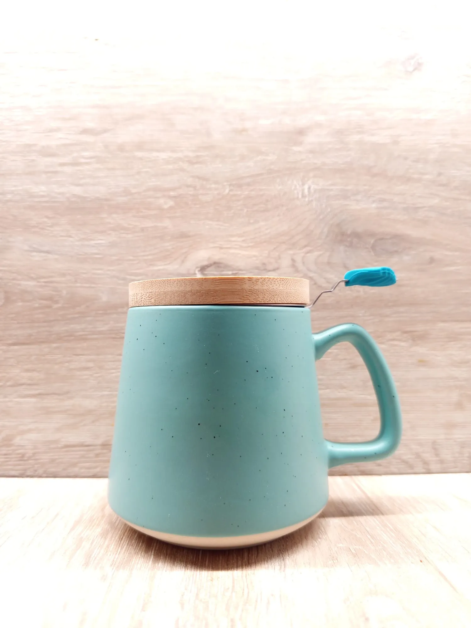 Il coperchio in bambù, posizionato su un supporto coordinato, completa l’insieme con un tocco di calore naturale. Il legno chiaro del bambù, materiale sostenibile e leggero, contrasta in modo armonioso con la ceramica e l’acciaio, conferendo alla tazza un’aura zen e meditativa. È un accessorio che protegge il tè dal freddo e dai contaminanti, mantenendone il profumo e il gusto intatti.